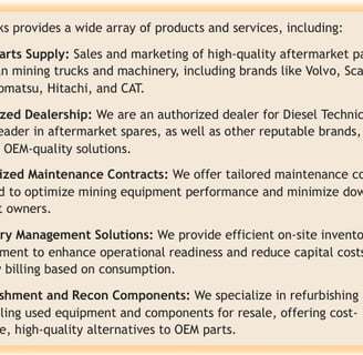 Our product and service offerings are comprehensive and tailored to meet the unique needs of each customer segment. We engage in the sales and marketing of both imported and domestic aftermarket spare parts for mining trucks and equipment, ensuring quality and reliability , As authorized dealers of Diesel Technic, a global leader in aftermarket spares for trucks and buses, we also distribute products from renowned brands such as ATS International, BJ Springs, Mansons, Elofic filters, and Balmerol Lubricants.
