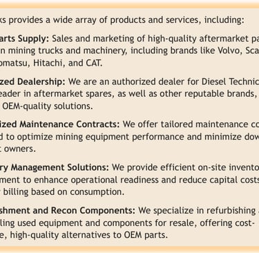 Our product and service offerings are comprehensive and tailored to meet the unique needs of each customer segment. We engage in the sales and marketing of both imported and domestic aftermarket spare parts for mining trucks and equipment, ensuring quality and reliability , As authorized dealers of Diesel Technic, a global leader in aftermarket spares for trucks and buses, we also distribute products from renowned brands such as ATS International, BJ Springs, Mansons, Elofic filters, and Balmerol Lubricants.
